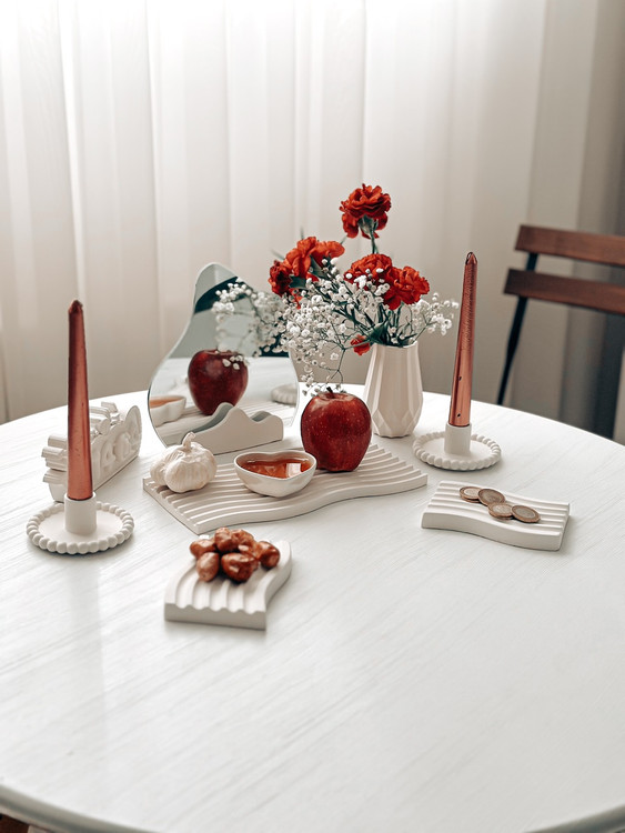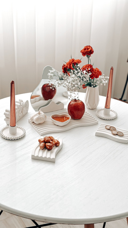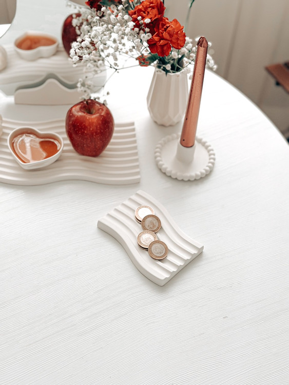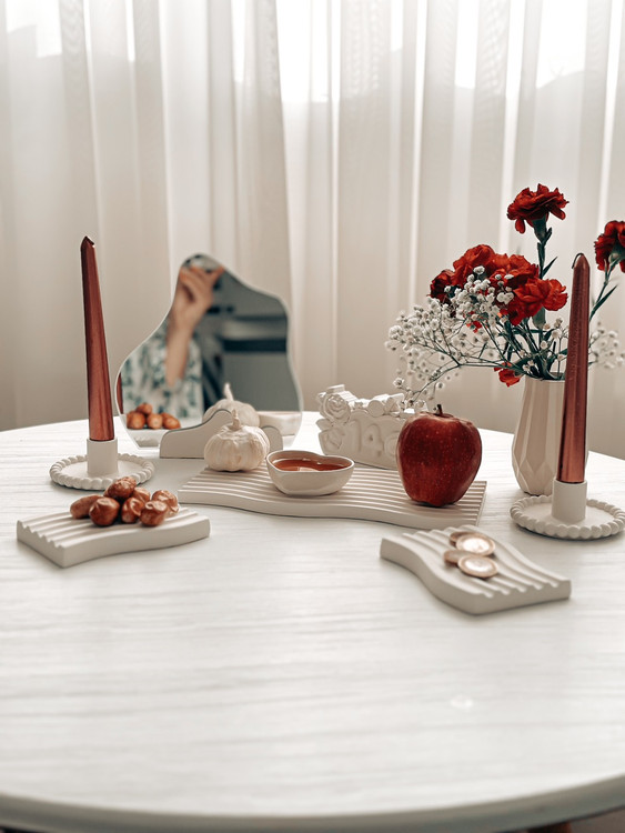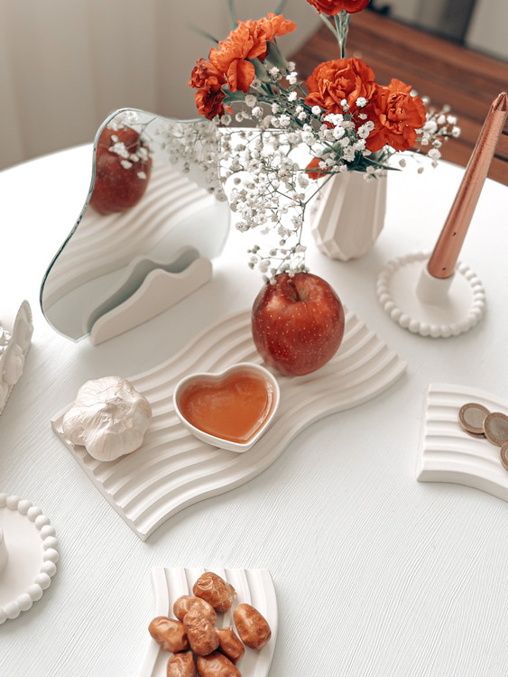 سینی موج مستطیلی استند همراه با آینه دو عدد مینی موج گلدان الماسی قلب کوچک دو عدد جا شمعی مرواریدی نماد سال