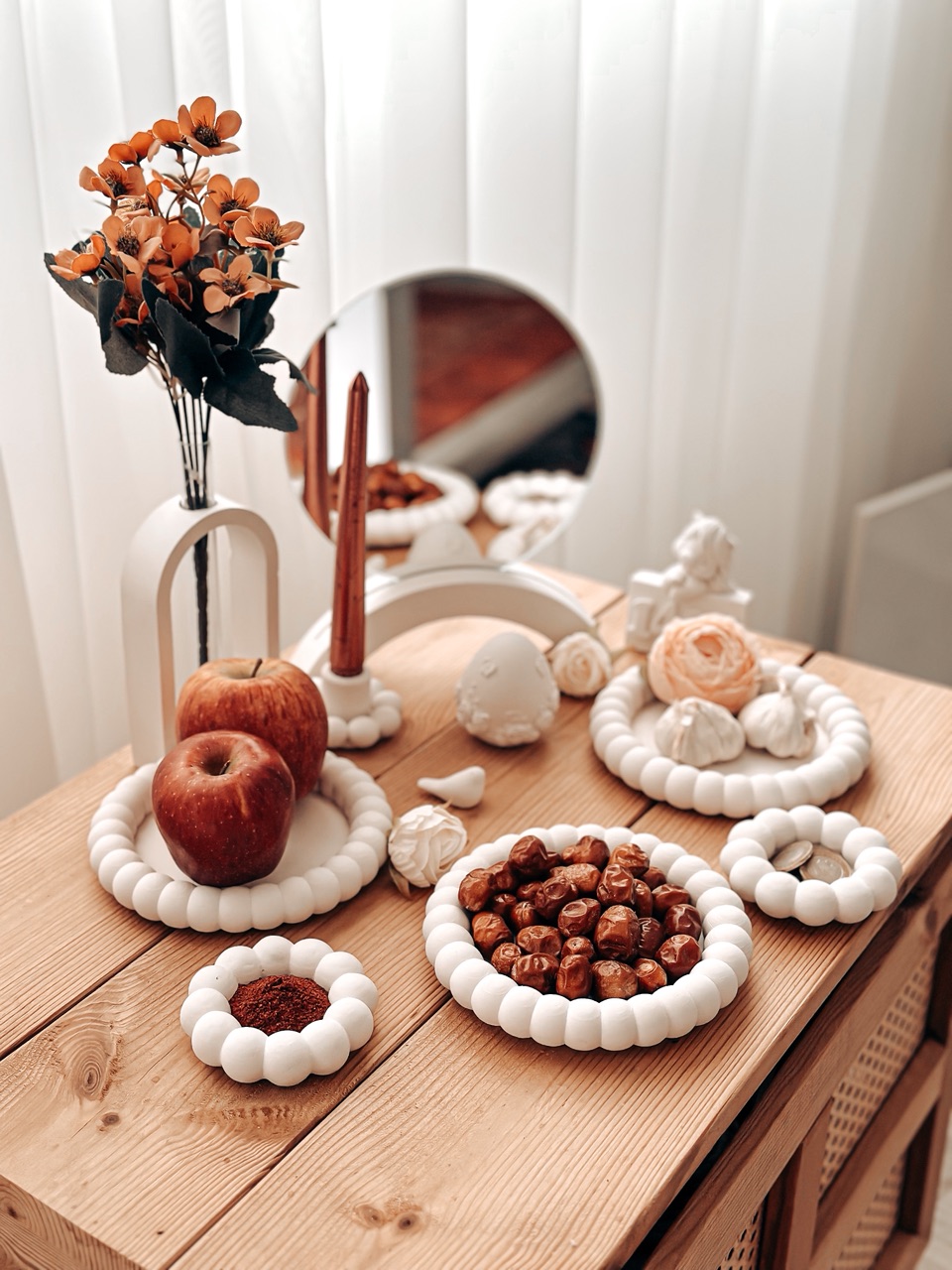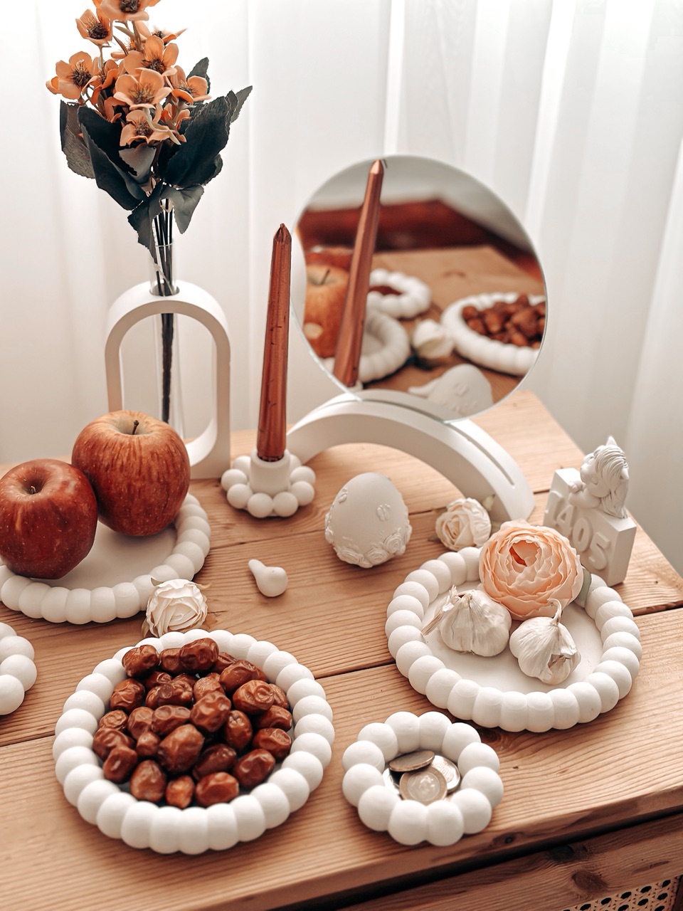 شامل: مرواریدی متوسط 3 عدد مرواریدی مینی 2 عدد استند آینه همراه با آیینه جا شمعی دسته مرواریدی تخم مرغ گلجای نماد سال